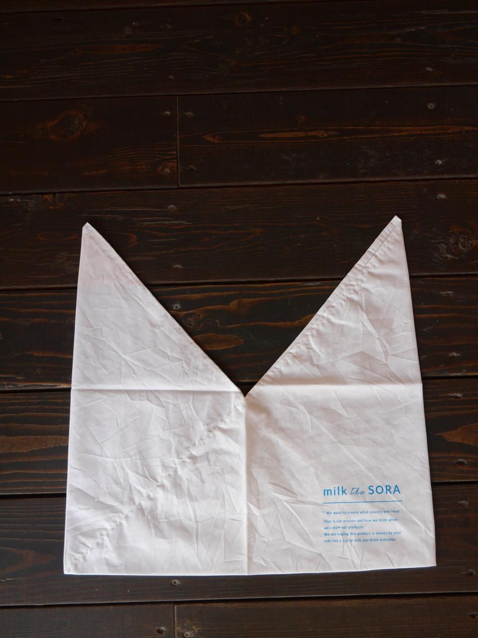 サイズは、幅48㎝×縦(持ち手含む)47㎝(小さくまとめたもの、5㎝×12㎝)