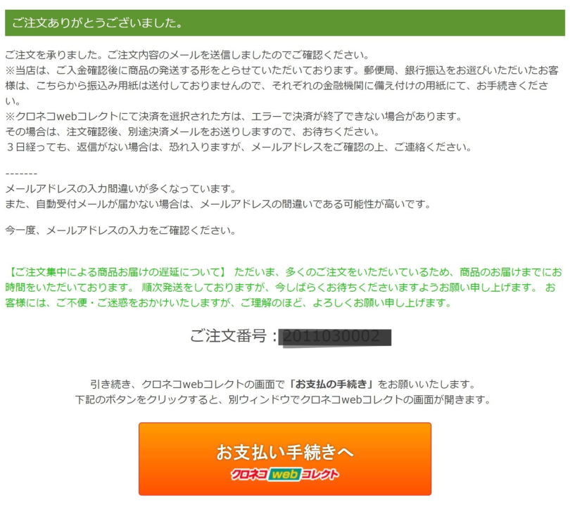 自動メールが届いていて、【ご注文商品のご確認】の注文確定メールが届いていない場合は、電話、メールにてお知らせください。